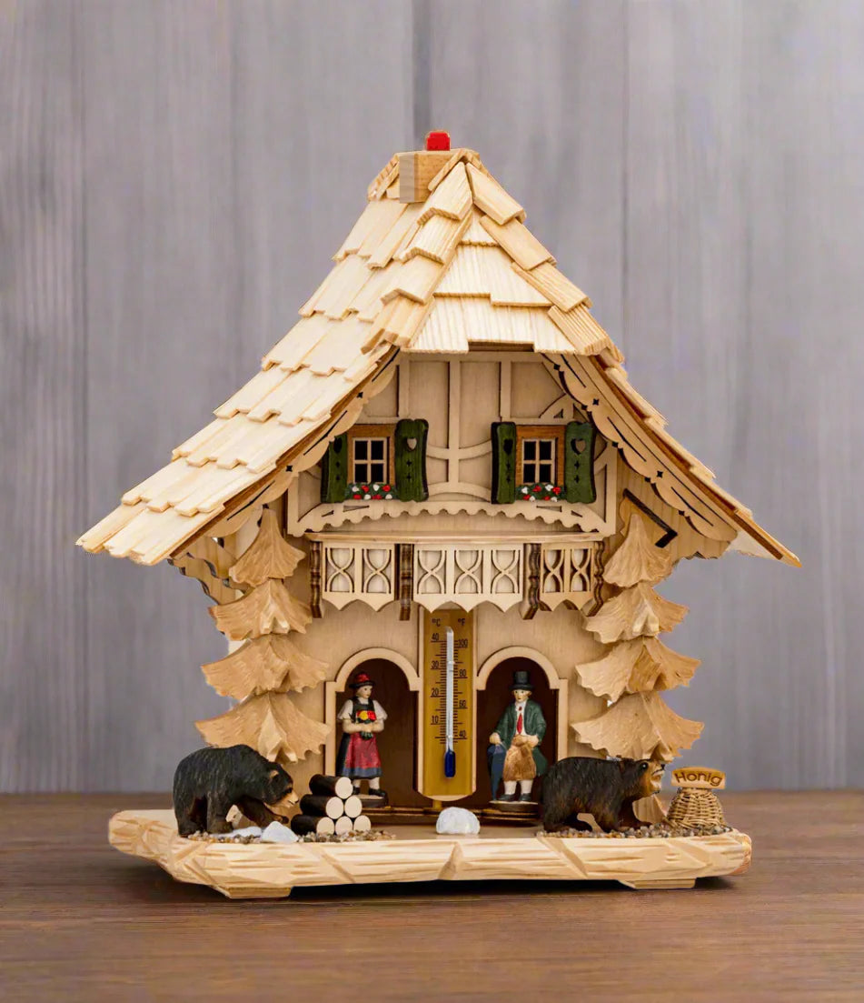 Add a dose of cozy charm to your space with our Barind Weather Station, featuring delightful figurines that emerge to predict sun or snow! Nestled in a quaint, woodsy chalet and topped with a traditional thermometer and curious bears, this piece blends functionality with forest whimsy.