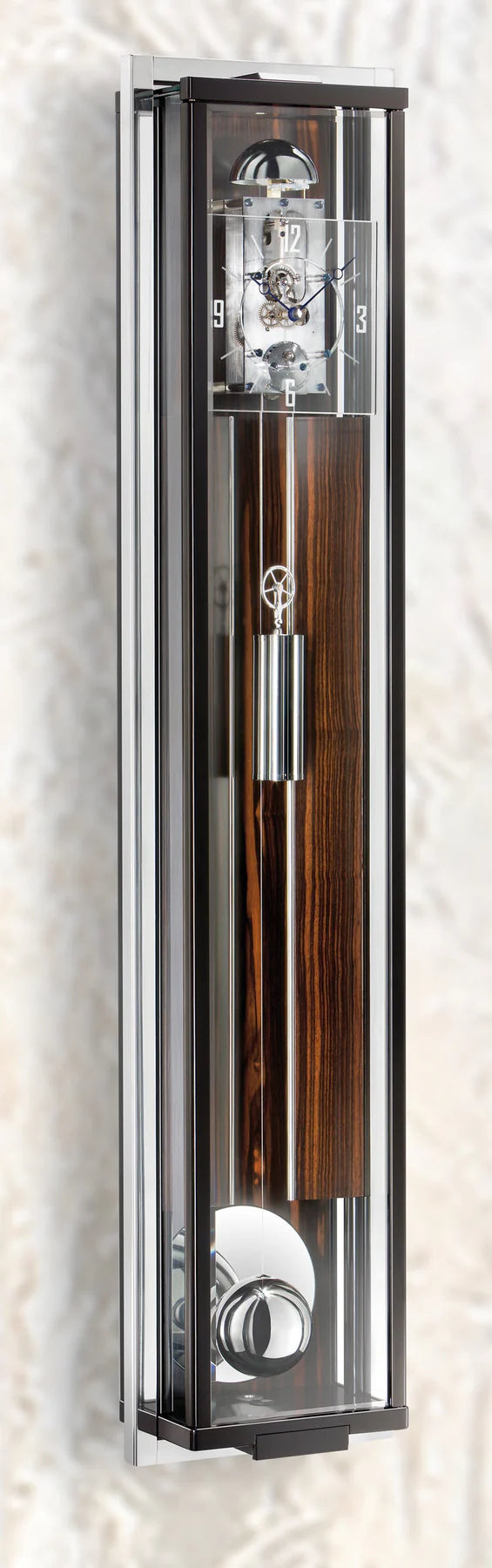 The Spherica is a monumental regulator with visible movement. It combines innovative features like a perfectly spherical pendulum bob, which creates a unique optical effect in the enlarging mirror directly behind. The large bell gives a pleasing passing single strike every hour.